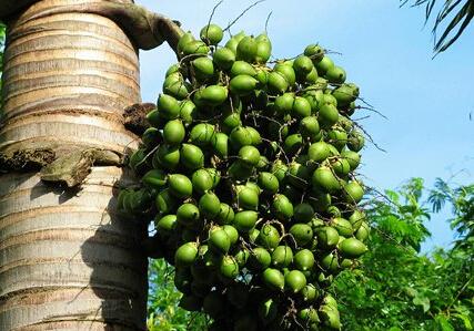 槟榔别名榔玉、宾门、青仔等,为棕榈科植物槟榔的种子,是我国传统的药材。它的花、种子和果实均可入药,一般主要作为驱虫药,已列入药典管理目录。嚼着吃的槟榔是将果实去核,用荖花(或称为榔叶)、石灰包裹制成,也有一些国家和地区是把槟榔、烟叶和其他一些原料混在一起制成嚼块。