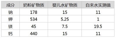 奶粉、婴儿水和自来水中的矿物质对比。依据:GB10765-2010 《食品安全国家标准 婴儿配方食品》,假设100mL冲调好的配方奶提供250千焦能量,6个月大婴儿一天喝750mL,奶粉矿物质含量以标准规定的上下限平均值计算。婴儿水矿物质含量按某产品标注的上限计算。自来水实测值来自北京某居民小区。单位为毫克。