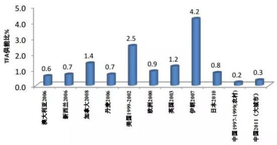 国家食品安全风险评估中心的评估结果显示,北京、广州这种大城市居民反式脂肪酸供能比仅为0.34%,远低于WHO的建议值(<1%),因此它对我国居民总体健康风险很低。美国反式脂肪酸供能比是我国大城市的8.3倍(1997 -2006),所以美国要控制反式脂肪酸的摄入。但我们也不可对此掉以轻心,因为仍有一些城市居民(约占0.42%)的反式脂肪酸供能比超过了1%。
