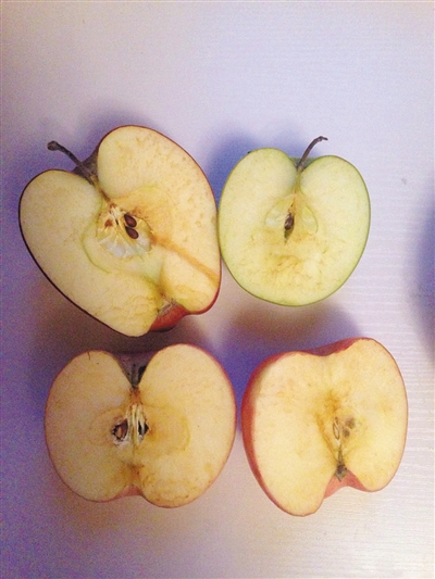 四种苹果切面均由原来颜色逐渐变黄,且呈丝状。其中两种红富士苹果表面黄色变化较为明显。蛇果表面的半侧相对明显,绿苹果的变化则最不明显。