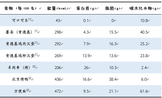 从上表里可以看出,像北京烤鸭、烤羊肉串这些很受大家欢迎的食品,它们的能量和脂肪含量相当高,看起来也符合“垃圾食品”的特点啊!例如,每100克北京烤鸭的的能量含量差不多是同样重量的汉堡包的2倍,脂肪含量也是汉堡包的2倍多。烤羊肉串的能量和脂肪也不低,好在蛋白质含量比较高。