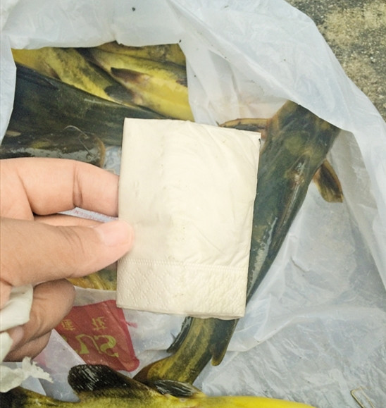 等这几条鱼全部死去后,记者拿纸再次擦拭鱼的肚皮发现,确实有一些淡黄色粘在纸上。不过,远没有“把手都染黄了”那么夸张。“鱼死了体表黏膜也没原先那么紧绷,很容易破,破了纸巾上就粘上了黄色,这也不奇怪。”