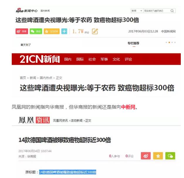 我最早看到这个消息是从微信群聊,信息大致归纳为:中国新闻网转述来自浙江FM(一个电台节目)的消息说央视曝光了德国啤酒致癌。