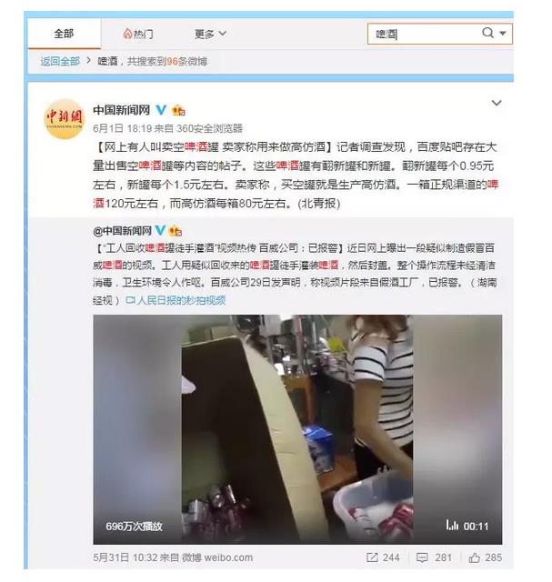 倒是中国新闻网最近发过一个假啤酒的微博。