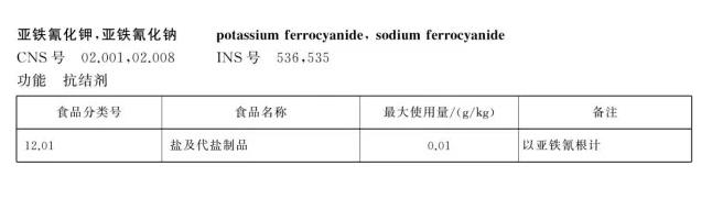 按照中国国家标准的规定,食盐中亚铁氰化钾的最大添加量为每公斤10毫克。
