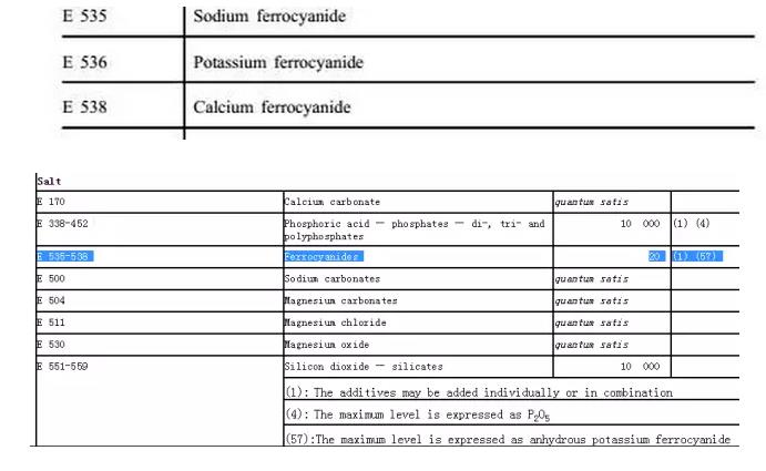 这是我从网络代购的宣传页找到在国外超市的产品,用了亚铁氰化钠。(代号E535)