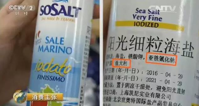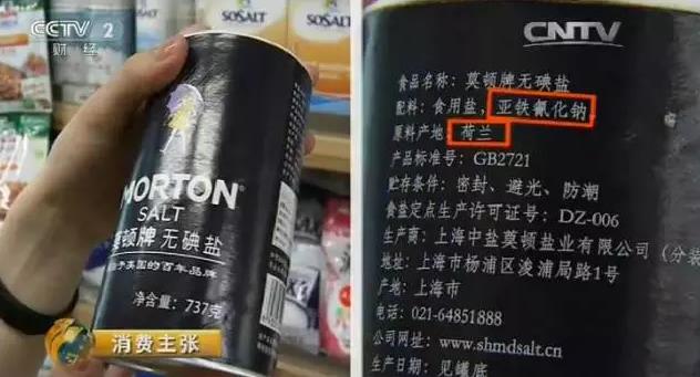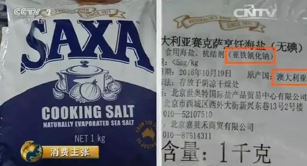 这是央视记者在一家大型连锁超市看到的,西班牙进口的食盐,使用了亚铁氰化钠,和亚铁氰化钾是一个功能。