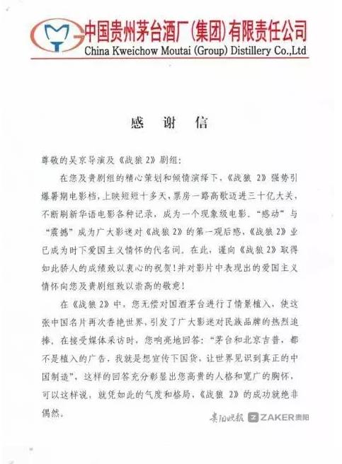 吴京说了,植入茅台和北京吉普都是免费的,就是要宣传中国品牌。