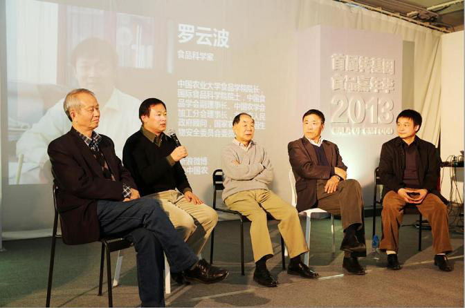出席“首届转基因食品嘉年华”活动的科学家现场回答观众的提问。从左至右依次为:中国农业科学院生物技术研究所研究员黄大昉、中国农业大学食品与营养工程学院院长罗云波、中国工程院院士陈君石、中国科学院遗传与发育生物学研究所研究员朱祯、中国农业科学院生物技术研究所所长林敏。
