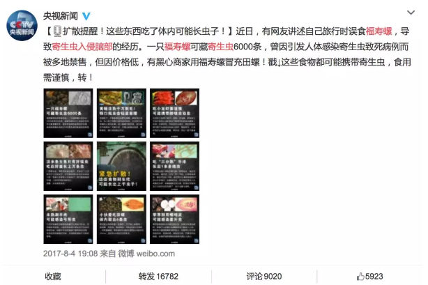 今年有位网友就因为在度蜜月期间吃了福寿螺导致寄生虫入侵脑部,结果导致做了六次腰部穿刺,打了近300次吊瓶,吃了十几盒打虫药……这样的杯具,我想大家都不希望发生在自己身上吧。