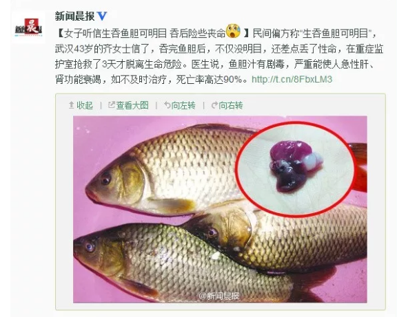 另外,民间一些新奇的饮食习俗也要尽量避免。比如,在过年期间很多地方都有杀鱼吃鱼胆的习惯,认为吃鱼胆能明目。但很多鱼的胆(尤其是鲤科鱼类)都是有剧毒的,如果食用很容易造成中毒,每年春节前后都有人因为吃鱼胆而导致中毒的案例,大家可千万要小心。