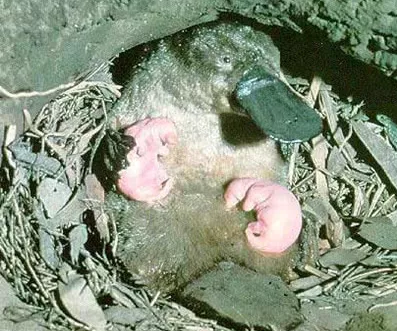 鸭嘴兽在进化上是个半拉子工程,它没有乳头,哺乳的时候就四仰八叉的躺着,腹部一些腺体分泌乳汁,从蛋里孵化出来的幼崽就趴在妈妈的腹部舔食乳汁。