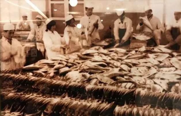 在百盛的餐馆里,我们见到了一张历史照片,显示了七十年代冷冻加工鲥鱼的场景。