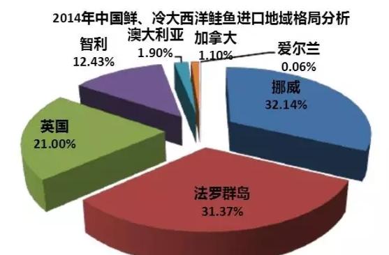 根据海关总署2014的数据,国内市场的三文鱼主要来自智利,那里有世界上著名的渔场,它也是世界第二大三文鱼出口国。