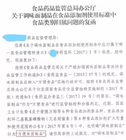 这一点已经在原食药总局的复函中明确,而且今年早些时候公布的调味面制品国家标准征求意见稿中也明确了这一归类方式。