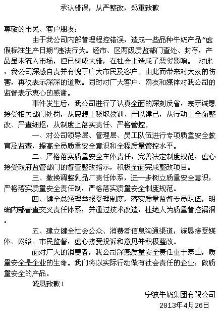 宁波牛奶官方微博称,由于公司内部管理程控错误,造成一些品种牛奶产品虚假标注生产日期“违法行为”,在社会上造成恶劣影响。对此宁波牛奶集团深感自责并有愧与广大市民及其客户,由此而带来对大家的伤害,再次表示深深的道歉。