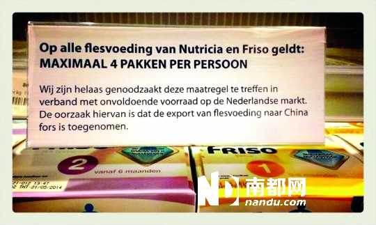 今年初荷兰超市的限购公告:Nutricia和F riso奶粉每人最多购买4罐,原因是出口至中国的奶粉数量猛增。