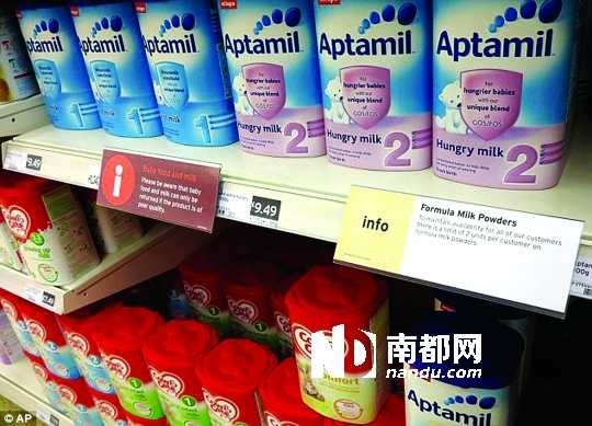 当地主要连锁超级市场“特易购”、“塞恩斯伯里”、“艾斯达”和“莫里森”在卖场挂出“限购”标识,针对达能、雀巢等生产商旗下品牌的婴儿奶粉,规定每名顾客限购两罐。