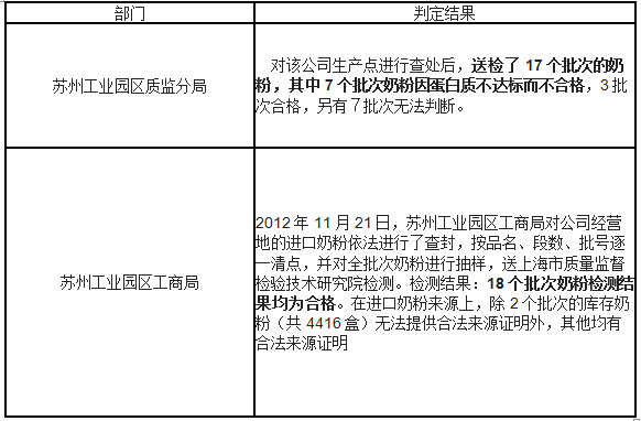 2012年11月21日,苏州工业园区工商局对该公司经营地的进口奶粉依法查封,按品名、段数、批号逐一清点,并对全批次奶粉进行抽样,送上海市质量监督检验技术研究院检测。结果显示:经营地18个批次奶粉全部合格。除2批次、共4416盒库存奶粉没有进口食品卫生许可证书外,其他均有合法许可证。
