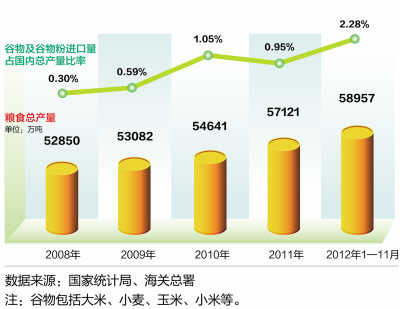 查阅计算了近5年来我国粮食进口与生产数据发现,2008年至2012年前11月,谷物及谷物粉进口量占国内生产量的比重分别为0.30%、0.59%、1.05%、0.95%、2.28%。也就是说,今年主要粮食自给率仍稳定在95%以上。此外,记者还发现,虽然近年来粮食进口增加,但每年仍有粮食出口。就在今年前11月,我国出口了大米、玉米51万多吨。