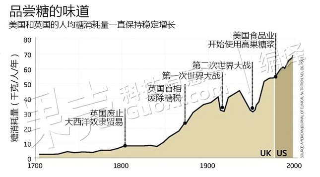 造成糖消耗量突飞猛进的原因很多,其中之一就是高果糖浆的发明。高果糖浆是一种粘稠的葡萄糖和果糖溶液,它像蔗糖一样甜,但通常要比蔗糖便宜30%。