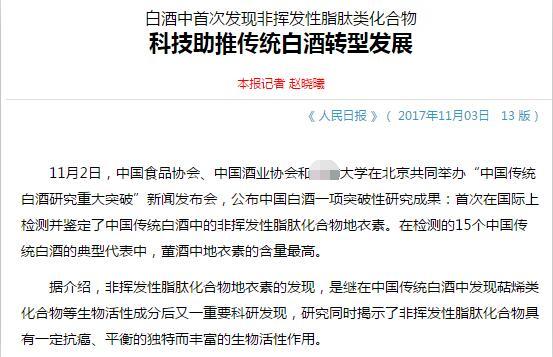 最近,微信上流传着一个关于白酒的“重大研究成果”让很多爱酒人士眼前一亮。大量媒体报道称,最新的研究发现:白酒中含有非挥发性脂肽化合物,具有抗癌、抗病毒、抗炎症、抗氧化的作用。这从现代科学手段证实了白酒特殊的健康价值,对于整个产业有非常积极的影响。白酒真的能抗癌?