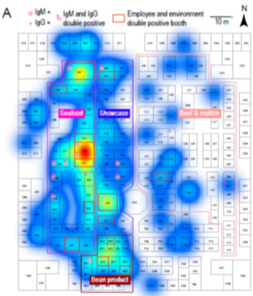 从感染的顾客中筛查到 5 个人,IgG 和 IgM 均呈阳性,他们在新发地的交集是 S14 摊位。(IgM 表示感染时间比较早)