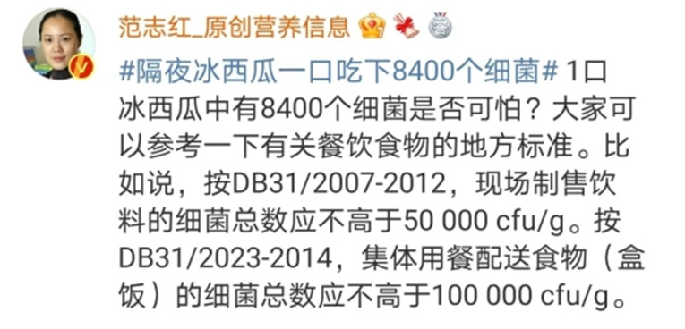 我们的环境中充满了细菌,食物中也充满了细菌。节目中“最不卫生”的那个操作,西瓜放隔夜后的细菌数是 8400 个 /25 克,也就是 336 个 / 克。