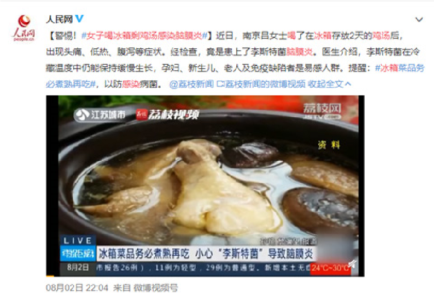 近日,南京吕女士喝了在冰箱存放2天的鸡汤后,出现头痛、低热、腹泻等症状。经检查,竟是患上了李斯特菌脑膜炎。