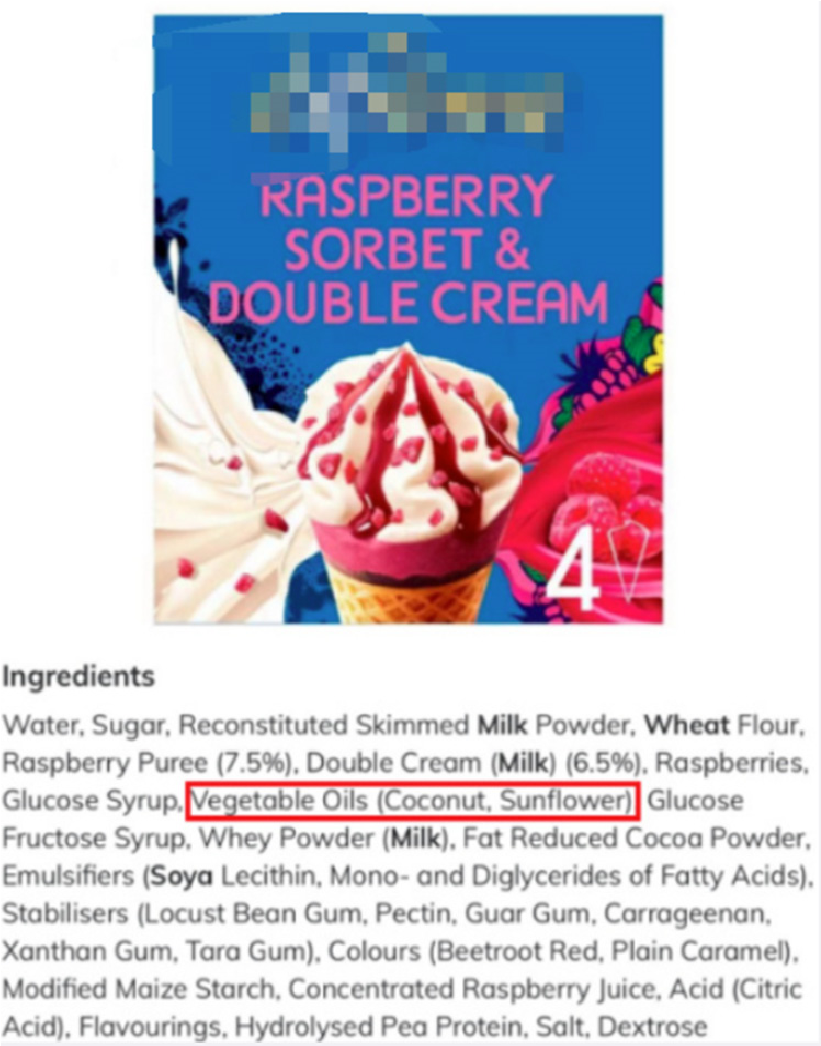 总有些人觉得“外国月亮圆”,其实植脂冰激凌也不是中国的特产,外国冰激凌里照样会用植脂,也没看到谁说这样的冰激凌就不好啊。我在网上看了一下,国外也很多冰激凌要用到椰子油、棕榈油(下面有3个例子)。当然,由于国外的标准和我们不一样,所以也不知道具体比例,但是看营养成分表里面的蛋白质、脂肪等指标,跟国内也没啥本质差异。