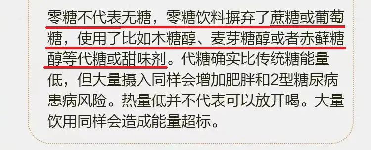 其中把“零糖不代表无糖”作为一个结论,然后解读是“零糖饮料摒弃了蔗糖或者葡萄糖,使用了比如木糖醇、麦芽糖醇或者赤藓糖醇等代糖或甜味剂”。