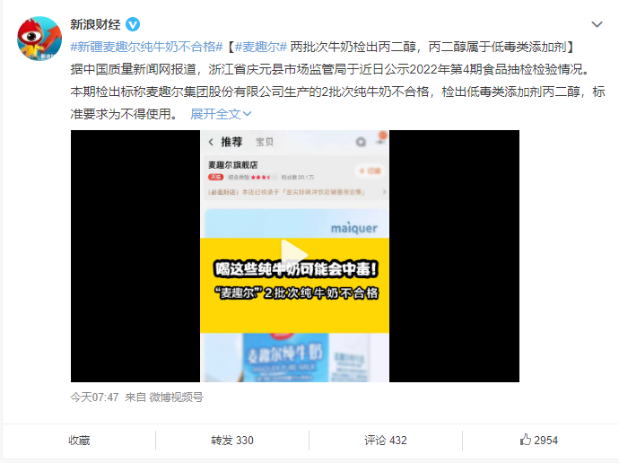 6 月 30 日,“新疆麦趣尔纯牛奶不合格”的词条一度冲上微博热搜第一。据中国质量新闻网报道,近日,浙江省庆元县市场监管局公示的 2022 年第 4 期食品抽检检验情况中称,麦趣尔集团股份有限公司(下称“麦趣尔”)生产的 2批次纯牛奶不合格,不合格项目为丙二醇。