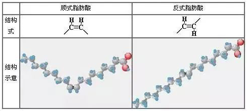 其中,氢化油是“臭名昭著”的反式脂肪酸来源。植物油的氢化是通过在不饱和键上加氢,使得油的熔点升高从而改善食品加工性能的操作。在不完全氢化的情况下,有一些双键从天然的“顺式结构”转化为“反式结构”,从而使得含有它们的脂肪成为“反式脂肪”。