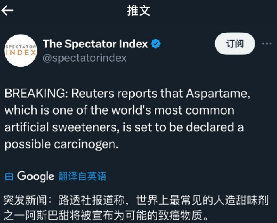 今天出了一条新闻,路透社报道称,世界上最常见的人造甜味剂之一阿斯巴甜将被宣布为可能的致癌物质。由于阿斯巴甜广泛用于无糖饮料和无糖口香糖,这个消息迅速被网络上的年轻人疯传,一度超过了各路明星八卦直冲微博热搜榜一。