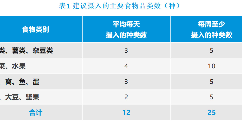 怎样才算“多样”呢?建议 :平均每天吃不同品种数达到 12 种以上,每周达到 25 种以上(表 1),烹调油和调味品不计算在内。