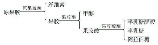 未成熟的水果中是原果胶,逐渐成熟后变成果胶,最后在水果后熟中,果胶被分解。