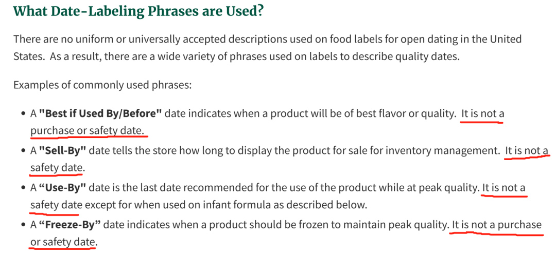 美国农业部网站有个问答,详细解释了四种不同“日期”的含义,分别是最佳赏味期、销售截止期、保存期(类似中国的保质期)、冷冻保存期。无一例外都强调不是安全日期。