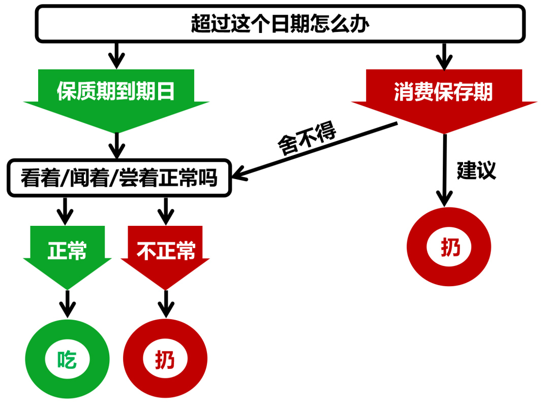 如果真有企业胆子大,标了消费保存期,应该怎么看呢?这个图可以供你参考。反正在我家,过不过期不重要,看着 / 闻着 / 尝着正常,就接着吃呗 ~