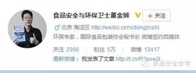 董金狮,1963年出生,陕西省大荔县人,常见介绍是“著名环境化学专家、食品安全专家,”其新浪博客自称“食品安全与环保卫士”。不过,资料显示他的最高学历为“环境化学硕士”。