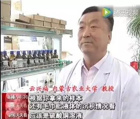 经专家鉴定,这种蓝色痕迹是一种叫硫酸铜的化学药剂,很可能是商贩在运输途中用来防腐保鲜的,而且用过硫酸铜的菜也会显得更绿。