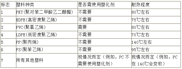 综合, 塑料制品在某种程度上方便了我们的生活,每一种塑料性质和使用条件都是有差异的,合理使用才能更好的保障安全。塑料制品一般都不是非常耐高温,温度较高时可能析出有害物质,因此平时使用时尽量避免长时间高温加热,具体到每一种产品的使用温度, 可以看下表。