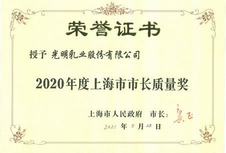 5 月 28 日上午,在 2021 年度上海市质量工作会议上颁发了 2020 年度上海市政府质量奖,光明乳业股份有限公司荣获本市最高质量荣誉——2020 年度上海市市长质量奖(组织),成为了该奖项自 2008 年设立以来首家获奖的食品企业。今年是中国共产党成立 100 周年,也是光明品牌诞生 70 周年,在这一特殊时刻获此至高荣誉于光明乳业而言更显重要意义,这是光明乳业在百年卓越之路上再创新里程碑的见证,是全面提高质量管理水平的重要成果展现,更彰显出其难以撼动的乳业巨擘地位。
