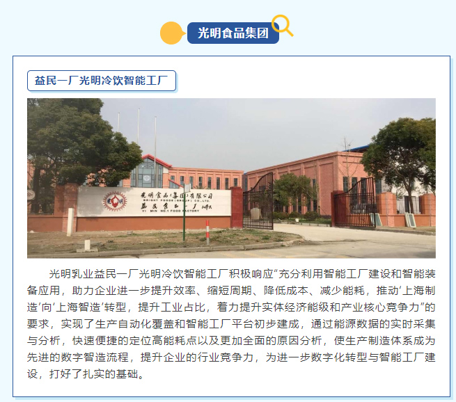 2024 年 1 月 3 日,上海市智能工厂建设工作推进会成功举办,光明乳业旗下益民一厂光明冷饮智能工厂被评为“2023年度上海市级智能工厂”,该厂通过能源数据的实时采集与分析,快速便捷的定位高能耗点以及更加全面的原因分析,为节能技改和降低能耗提供方向和支持,提高工作效率。工厂自建成以来就一直以节约资源和保护环境为宗旨积极实现生产过程节能化,实现了节能效果数据追溯,数据记录和实时效果呈现。通过智能化建设,益民一厂直接提高了运营效率,实现智能化生产模型化的分析决策,将全过程管理的质量、成本、设备等报表式跟踪转化为数字化、智能化的管理系统动态追踪,大幅度提高生产效率和产品合格率。