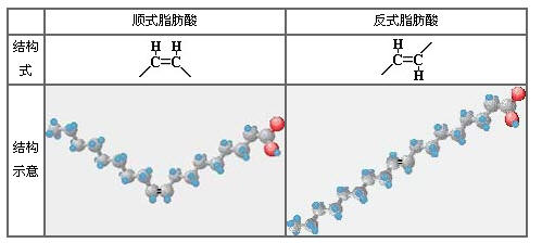 下图分别是顺式和反式脂肪酸的化学结构示意图。简单说呢,顺式就是“V”字形,反式是“一”字型。