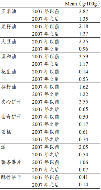 随着媒体的大量报道,你的直观感觉肯定是这样的。但实际情况并非如此,大多数食物中反式脂肪的含量和前些年比都在显著下降,比如下图所列12种典型食品仅有两个含量上升的。