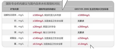 各国不同机构(不一定是官方)在婴幼儿用水方面各有建议,但其中的推荐指标参差不齐,并未达成一致。比如对钙含量的限定,法国为≤100mg/L,奥地利为≤175mg/L;而对硫酸盐的规定,法国为≤140mg/L,奥地利则为≤240mg/L。德国规定了钠和硫酸盐,却对钙镁指标没有要求。