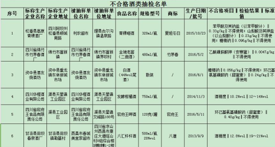 上述4批次产品分别为,四川省松潘县高原青稞酒厂生产的青稞咂酒、四川省绵竹市竹茅春酒厂生产的金驰老窖(二曲酒)、四川省资中县资中县酒友烧酒坊生产的白酒、四川省宕府王食品有限责任公司生产的宕府王呷酒。