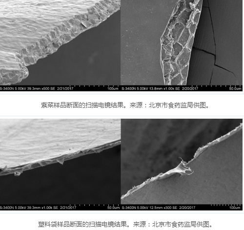 北京市食品安全监控中心吴燕涛博士说,针对近期网络上热传的“用塑料袋制作紫菜”的视频,综合考虑紫菜和塑料袋的品质特性及两者的差异性,北京市食品安全监控和风险评估中心制定了紫菜鉴别方案,利用氨基酸分析仪、红外光谱仪、扫描电镜等技术手段,对45个紫菜样品进行了真伪鉴别和具有一定特征成分的检测。