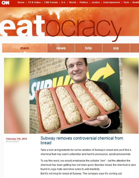 赛百味面包里含有“鞋底”?我看到这则新闻的时候不禁小心肝一颤,细细思量最近吃过几次subway:上上周似乎去过两次,去年似乎去过好多个两次……本着说啥也要给自己的胃讨个公道的决心,八了一下这个消息,原来是这样啊: