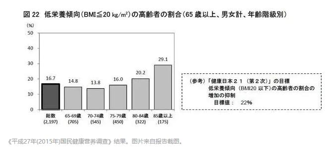 从图中可以看出,日本老年人65岁以上老年人中BMI<20的人只有16.7%。根据《中国老年人营养与健康报告》,我国48.4%的老年人营养状况不佳。这恰恰说明日本老年人的健康水平还是比较高的。